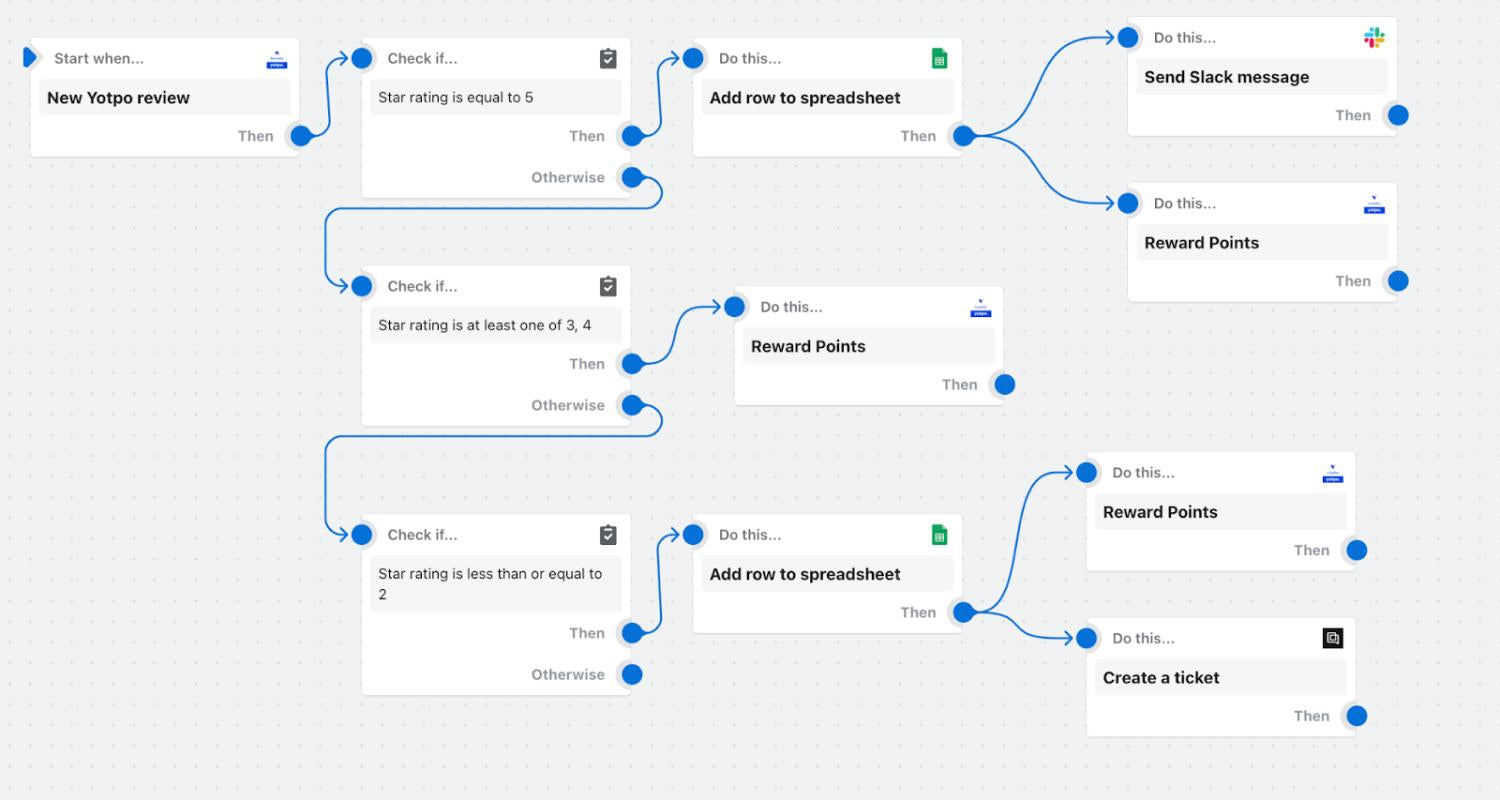 เมื่อมีรีวิวใหม่เข้ามา Flow จะตรวจคะแนนและเลือกการทำงานที่เหมาะสม เช่น รีวิว 5 ดาวจะถูกบันทึกลงสเปรดชีตและแชร์ให้ทีมเซลส์–มาร์เก็ตติ้ง เพื่อรู้สิ่งที่ลูกค้าชอบเกี่ยวกับสินค้า