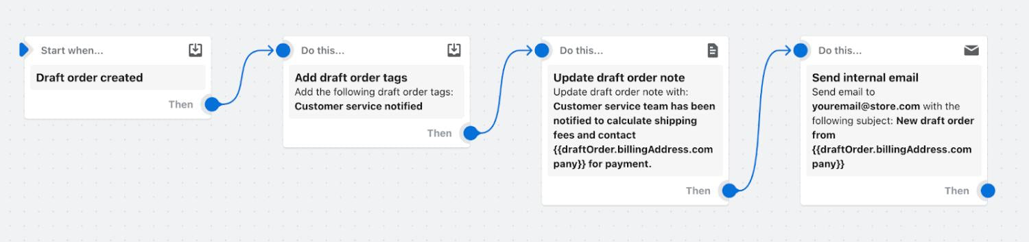 บางเวิร์กโฟลว์ควรเป็นแบบง่ายๆ และทำหน้าที่เฉพาะทาง เช่น เวิร์กโฟลว์นี้ เมื่อมีการสร้าง Draft Order ไม่ว่าจะทำด้วยมือหรือมาจากช่องทางขายส่ง Flow จะส่งการแจ้งเตือนไปยังทีมบริการลูกค้า เพื่อให้ทีมเพิ่มค่าขนส่ง ตรวจสอบคำสั่งซื้อ และเก็บเงินให้เรียบร้อย