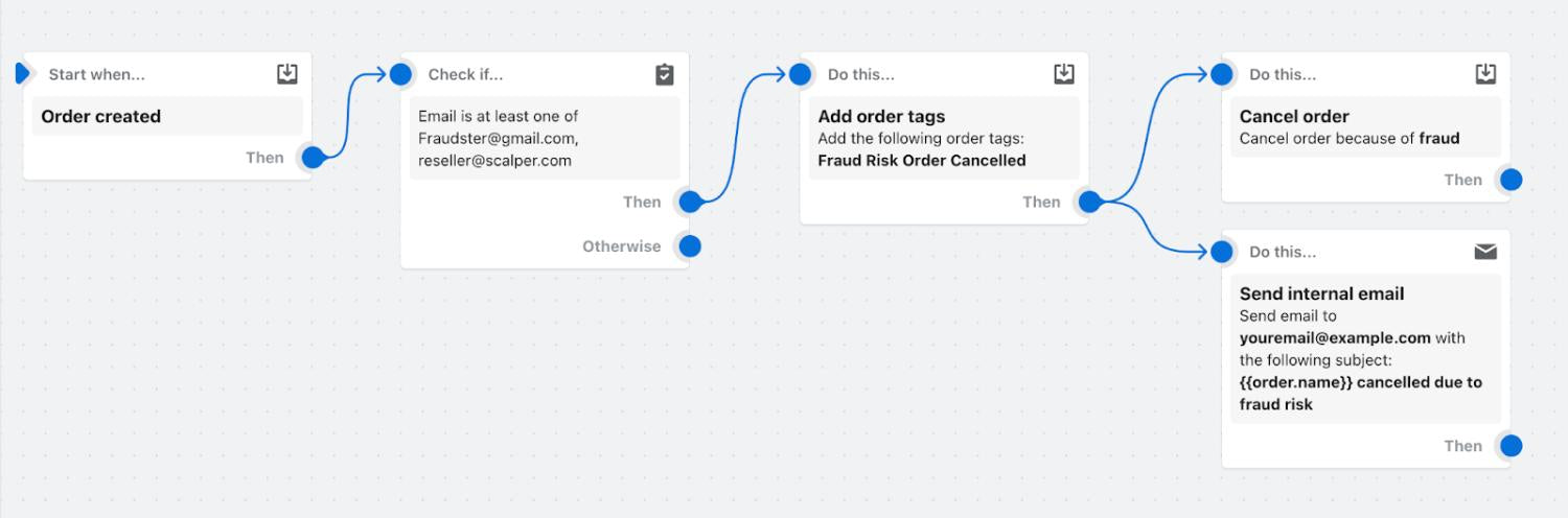 จากนั้น หากมีออเดอร์ใหม่จากอีเมลที่เคยถูกขึ้นบัญชีดำ Flow จะยกเลิกออเดอร์นั้นอัตโนมัติทันที แม้มิจฉาชีพบางรายอาจหาวิธีหลบเลี่ยงได้ แต่เวิร์กโฟลว์นี้ช่วยสกัดการยิงคำสั่งซื้อปลอมแบบอัตโนมัติได้อย่างมีประสิทธิภาพ