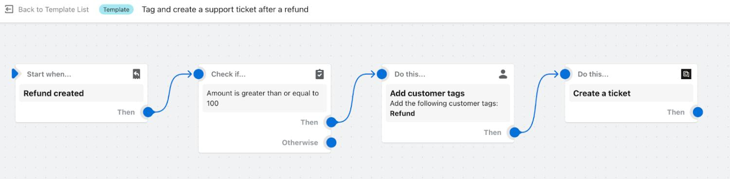 เวิร์กโฟลว์นี้ช่วยติดแท็กลูกค้าที่เคยคืนสินค้ามูลค่ามากกว่า 100 ดอลลาร์ในออเดอร์เดียว จากนั้นคุณสามารถสร้างทิกเก็ตให้ทีมบริการลูกค้าโทรหรือส่งข้อความตามไปสอบถามว่าเพราะอะไรลูกค้าไม่พอใจสินค้า หรือประสบการณ์ส่วนไหนที่ควรปรับปรุง เทมเพลตนี้ใช้ Gorgias Shopify app เพื่อแท็กและสร้างทิกเก็ตอัตโนมัติหลังจากมีการคืนเงิน
